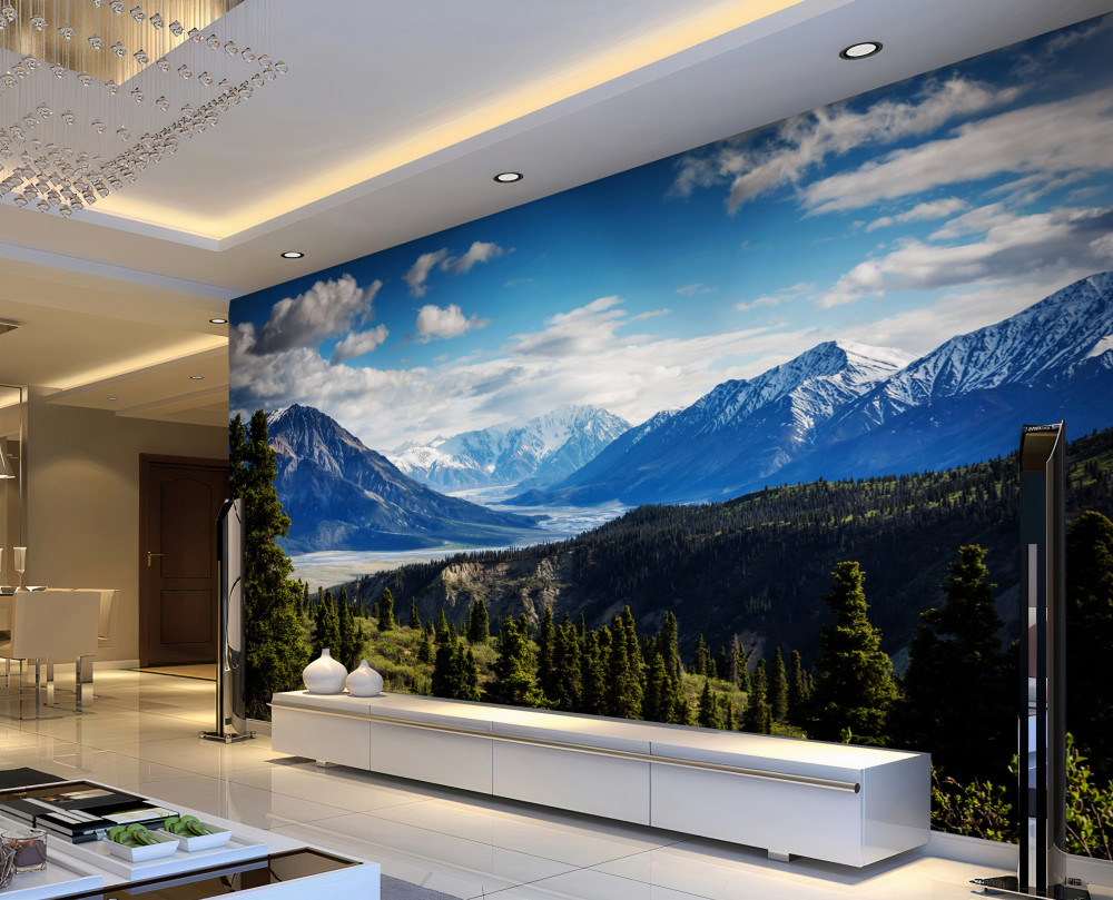 Tapeta Fototapeta skraj lasu z drzewami i widokiem na góry (artykuł a92988 ) z kategorii Fototapety Natura