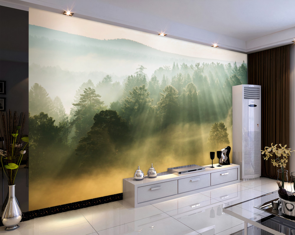 Tapeta Fototapeta słońce rozprasza gęstą leśną mgłę (artykuł a93335 ) z kategorii Fototapety Natura
