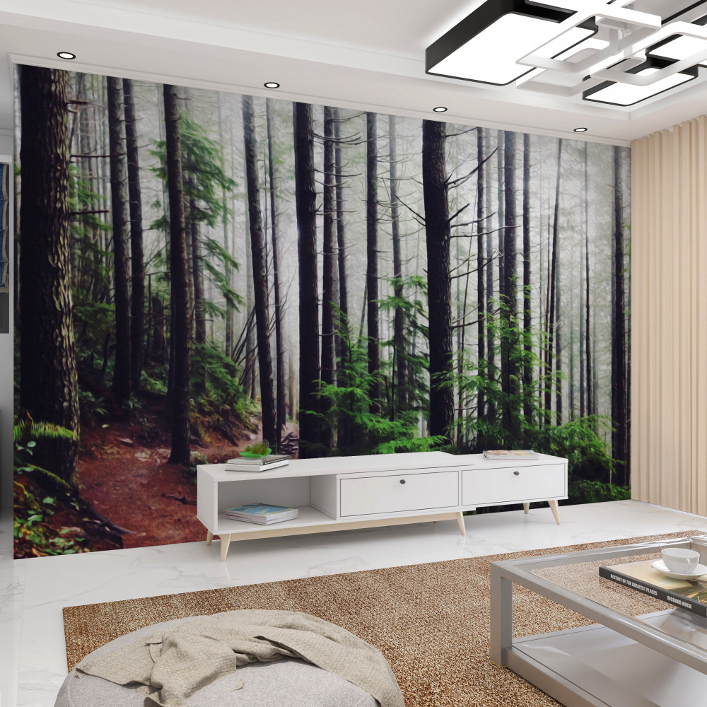 Tapeta Fototapeta smukłe drzewa w mglistym lesie (artykuł pb4488 ) z kategorii Fototapety Natura