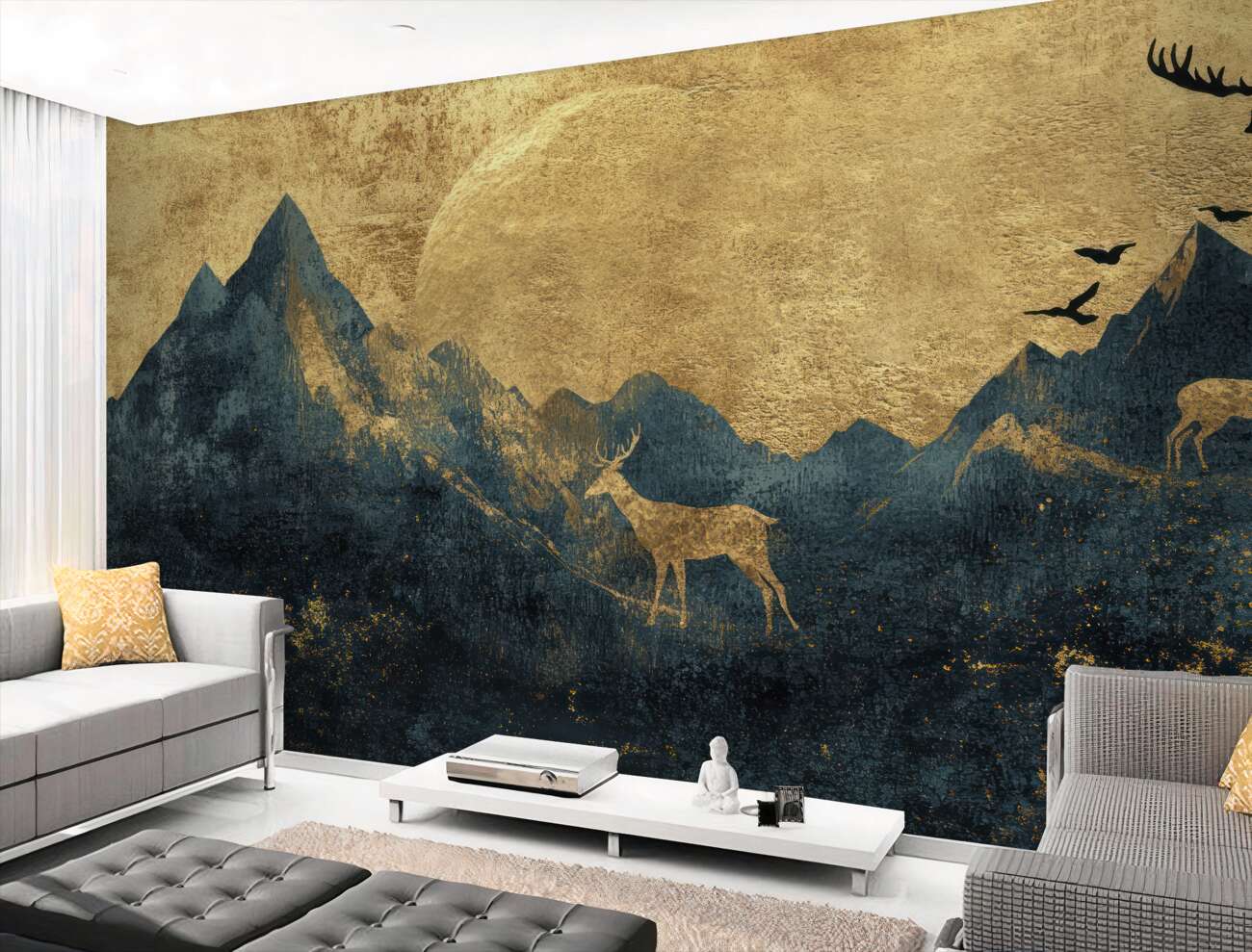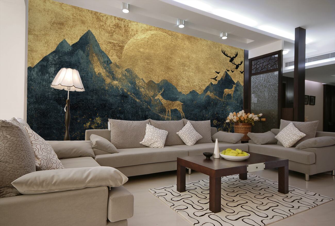 Tapeta Fototapeta Sylwetki jeleni i ptaków w górach (artykuł u14444 ) z kategorii Fototapety Natura