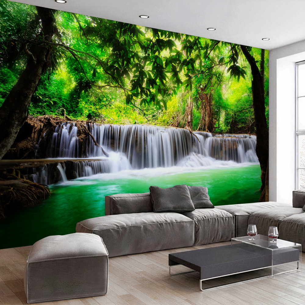 Tapeta Fototapeta szmaragdowe wody górskiego wodospadu w lesie (artykuł a92417 ) z kategorii Fototapety Natura