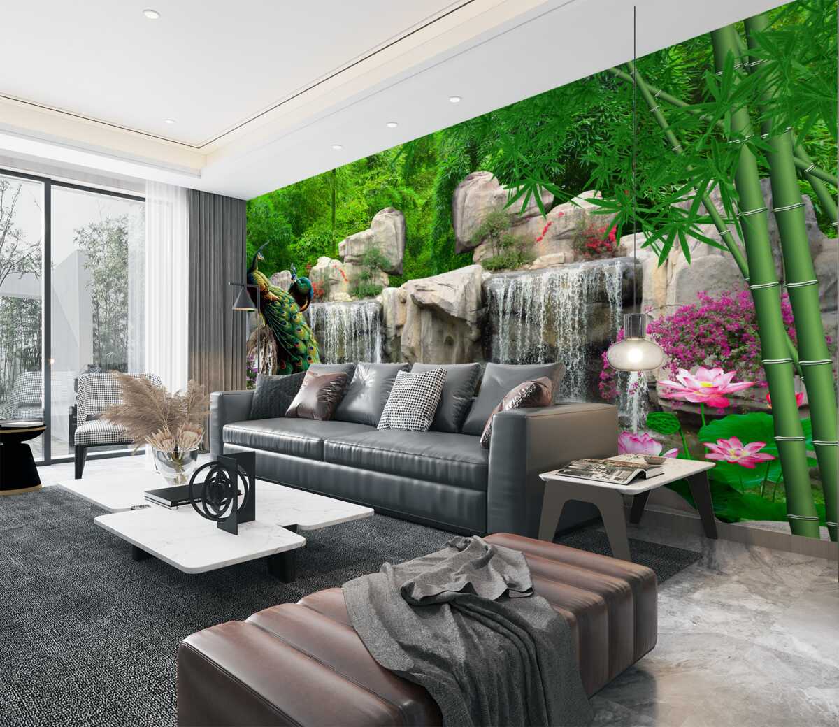 Tapeta Fototapeta Wodospad z pawiami (artykuł a98788 ) z kategorii Fototapety Natura