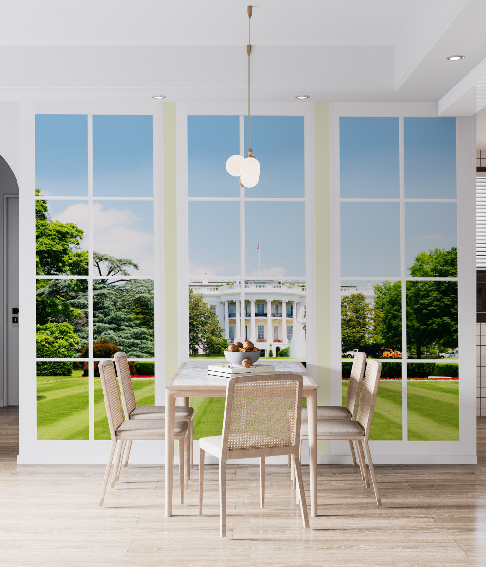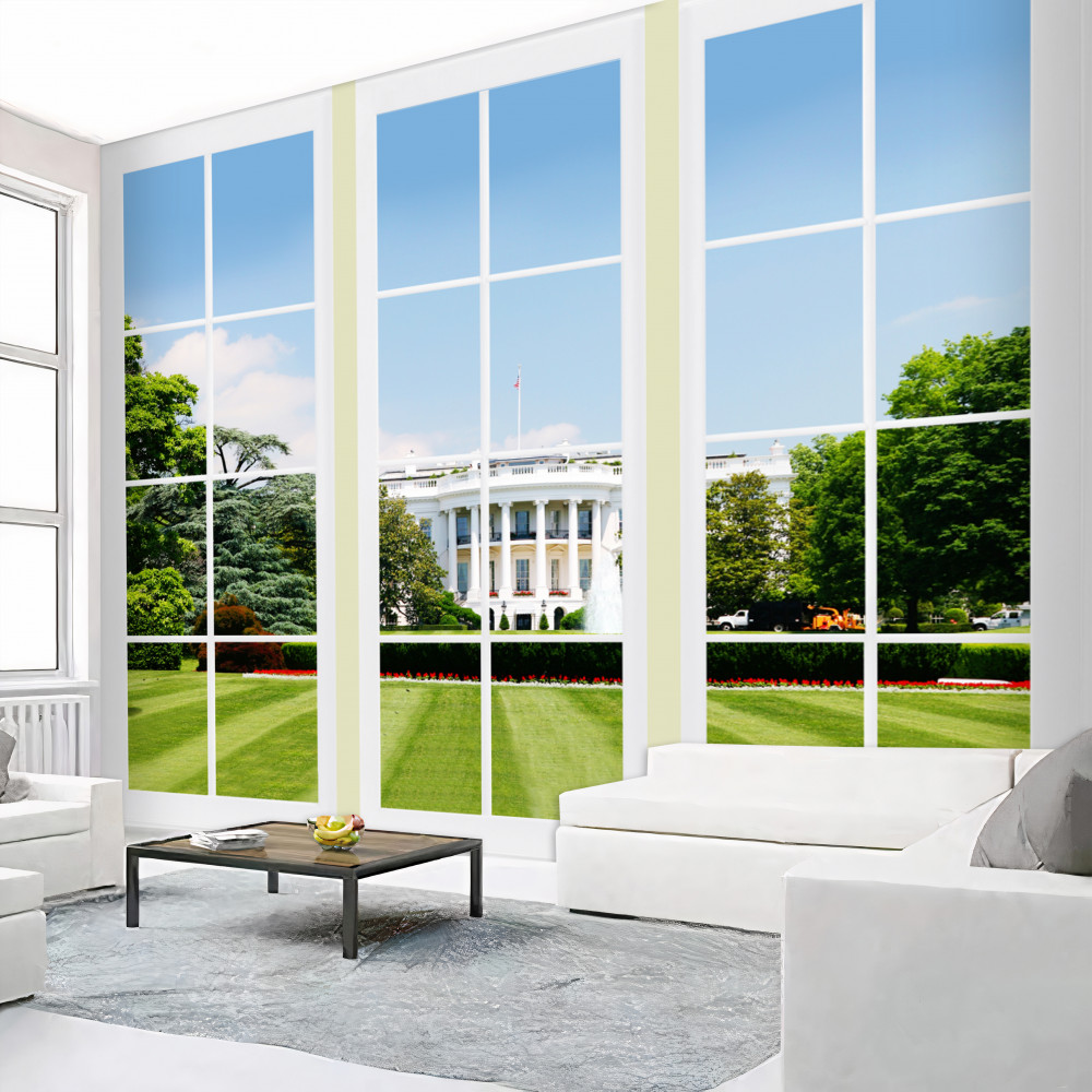 Tapeta Fototapeta biały dom z łąką za oknami (artykuł a89573 ) z kategorii Fototapety Okno