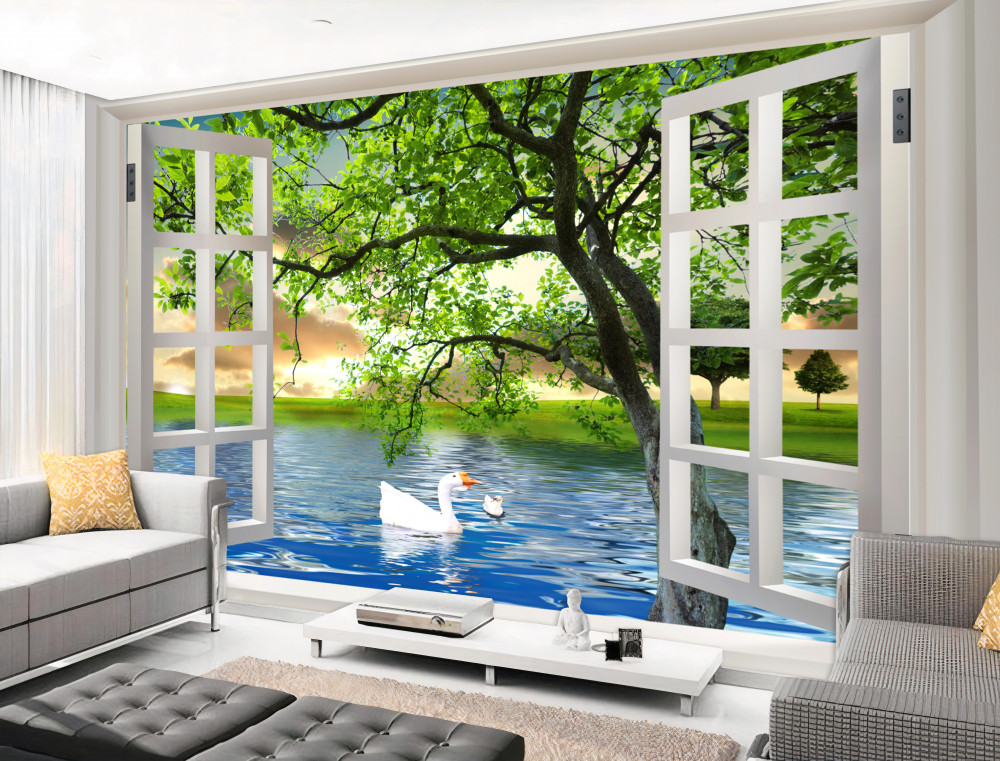 Tapeta Fototapeta łabędź na wodzie za oknem (artykuł a91636 ) z kategorii Fototapety Okno