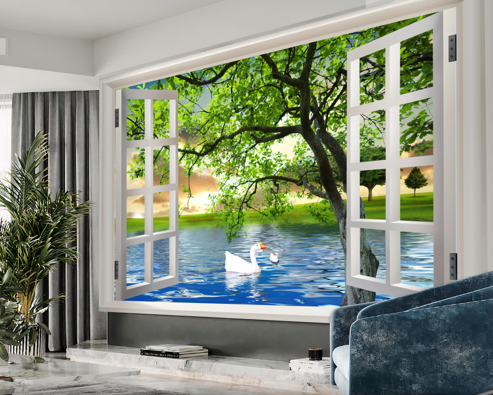 Tapeta Fototapeta samotny biały łabędź na wodzie z okna (artykuł a91603 ) z kategorii Fototapety Okno