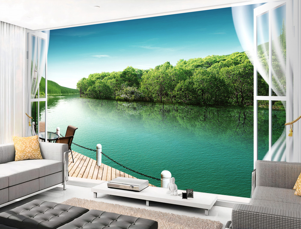 Tapeta Fototapeta weranda w pobliżu zielonego jeziora (artykuł a92005 ) z kategorii Fototapety Okno