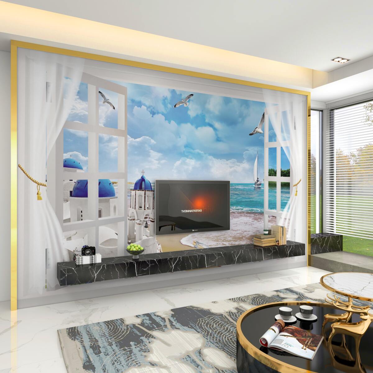Tapeta Fototapeta Widok z okna na grecką plażę (artykuł a98791 ) z kategorii Fototapety Okno