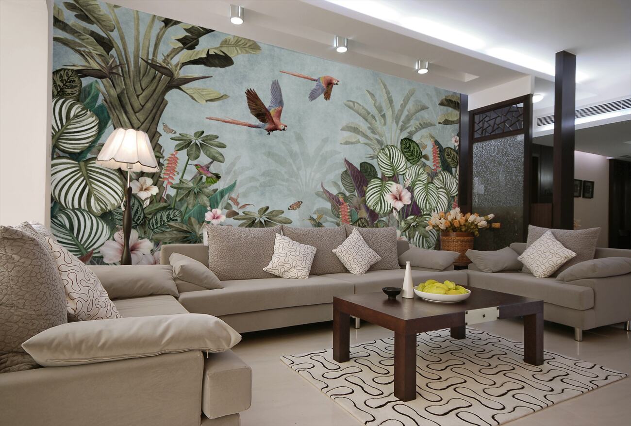Tapeta Fototapeta Papugi nad kwitnącymi tropikami (artykuł a99922 ) z kategorii Fototapety Pejzaże
