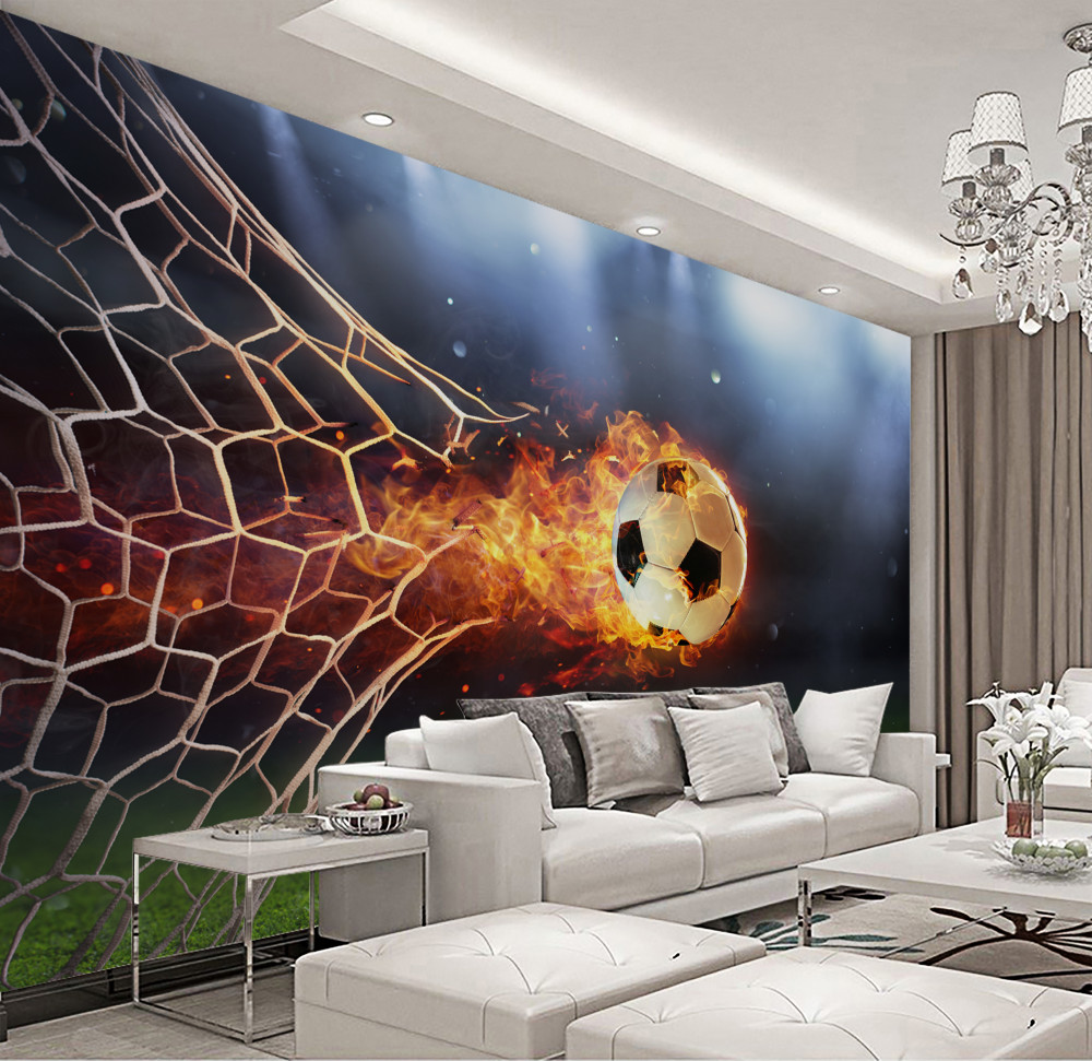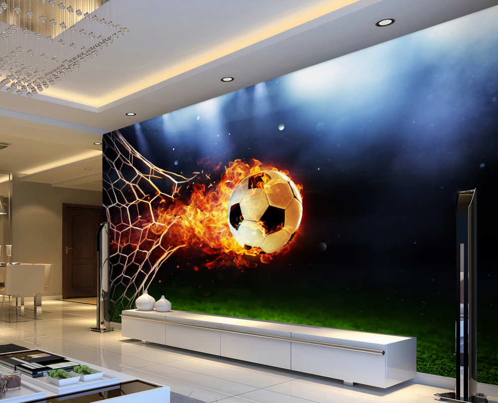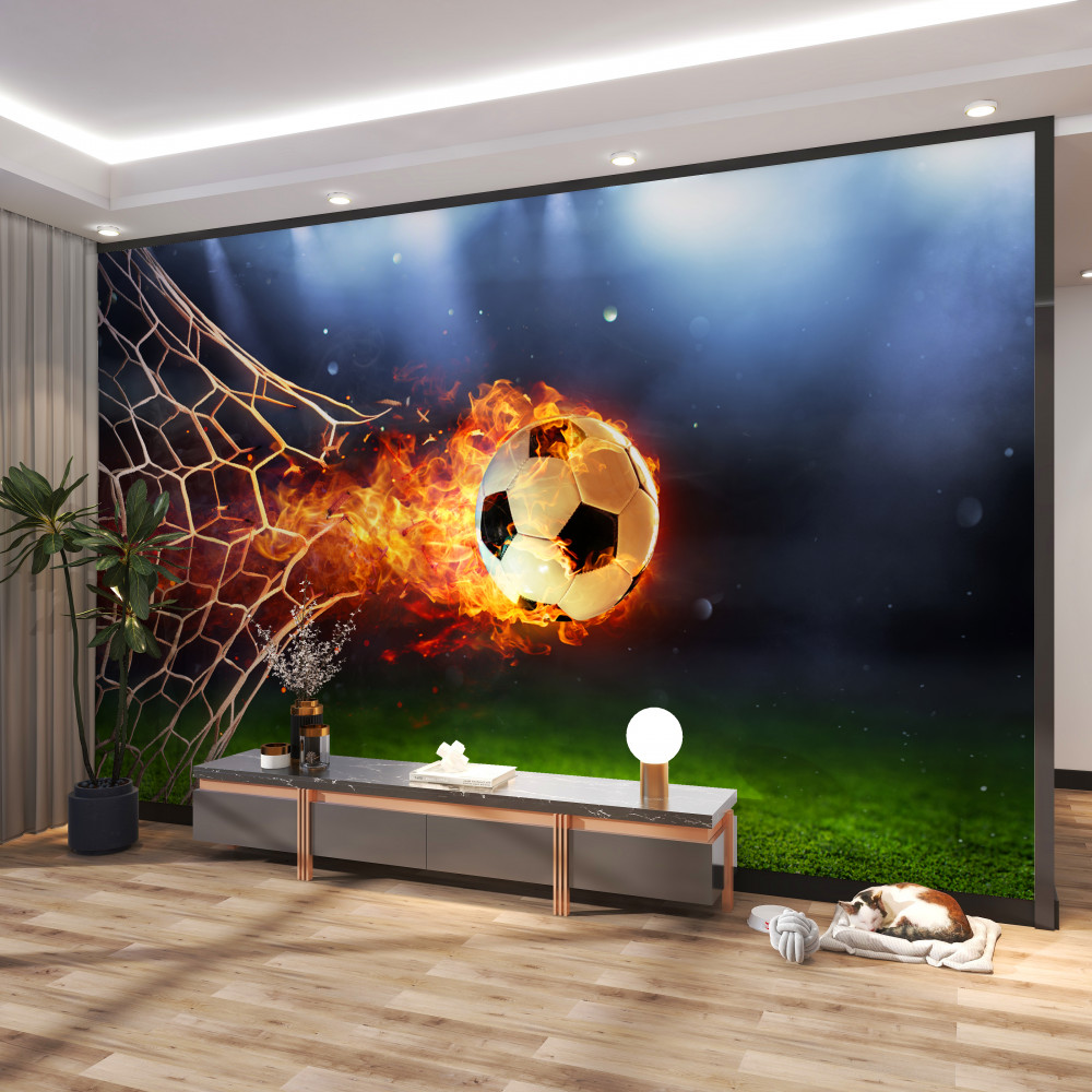 Tapeta Fototapeta płonąca piłka przebija siatkę bramkową (artykuł a93184 ) z kategorii Fototapety Piłka Nożna