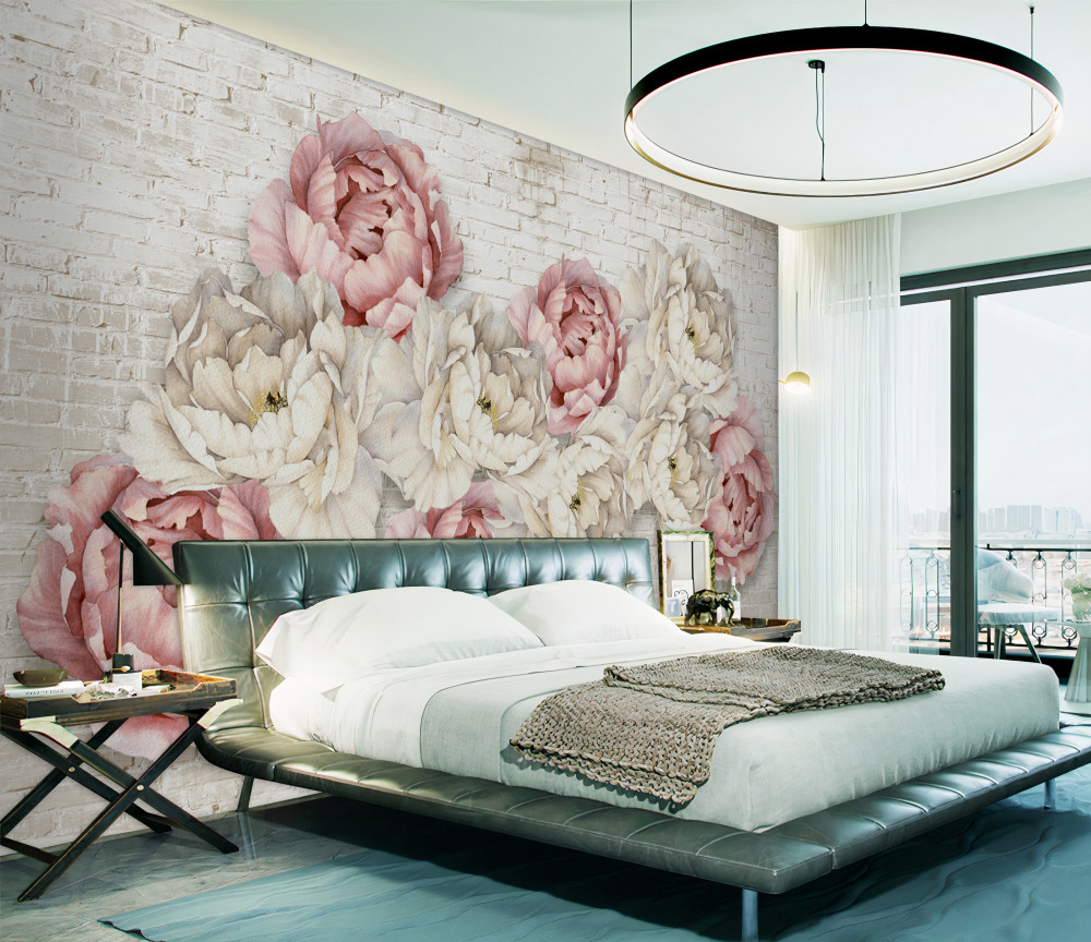 Tapeta Fototapeta białe i różowe pąki na ceglanym tle (artykuł a93376 ) z kategorii Fototapety Piwonie