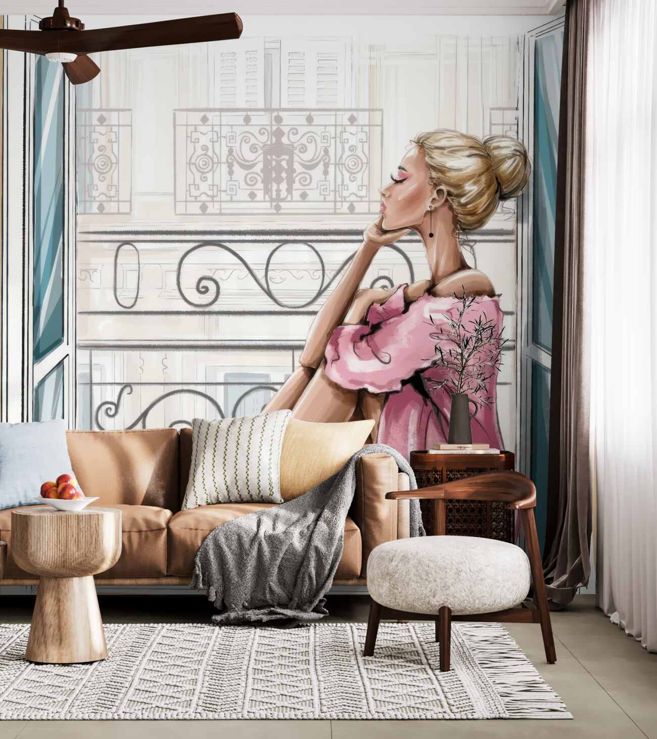 Tapeta Fototapeta Dziewczyna na ilustracji balkonowej (artykuł a99464 ) z kategorii Fototapety Pop-art