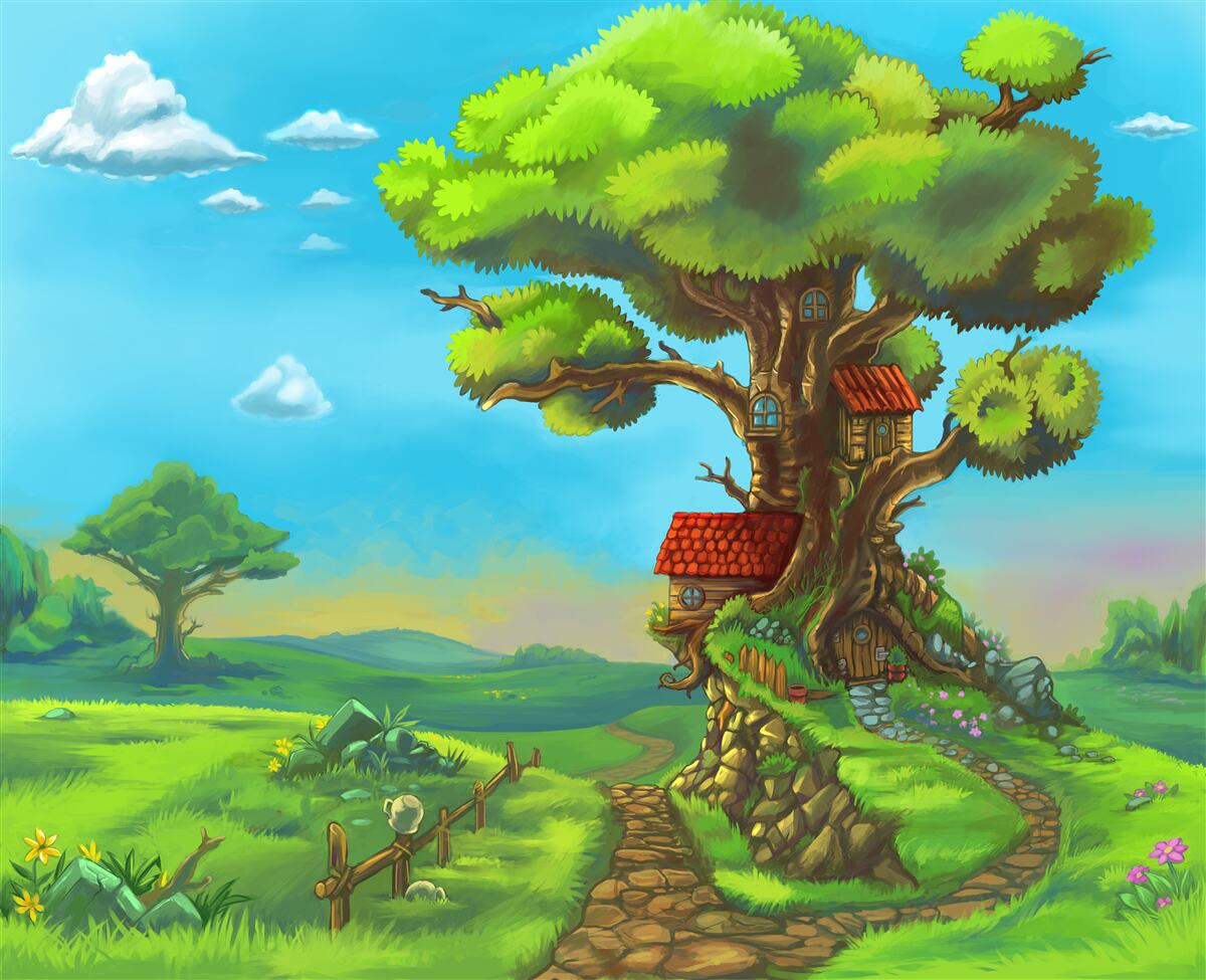Tapeta Fototapeta bajkowe domy na zielonym drzewie (artykuł a97421 ) z kategorii Fototapety Popularne