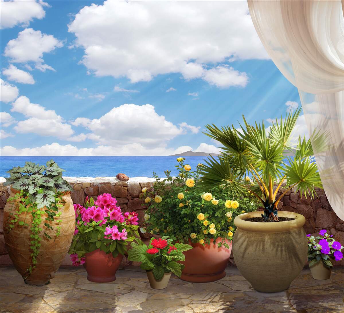 Tapeta Fototapeta balkon pełen kwiatów doniczkowych (artykuł a96953 ) z kategorii Fototapety Popularne