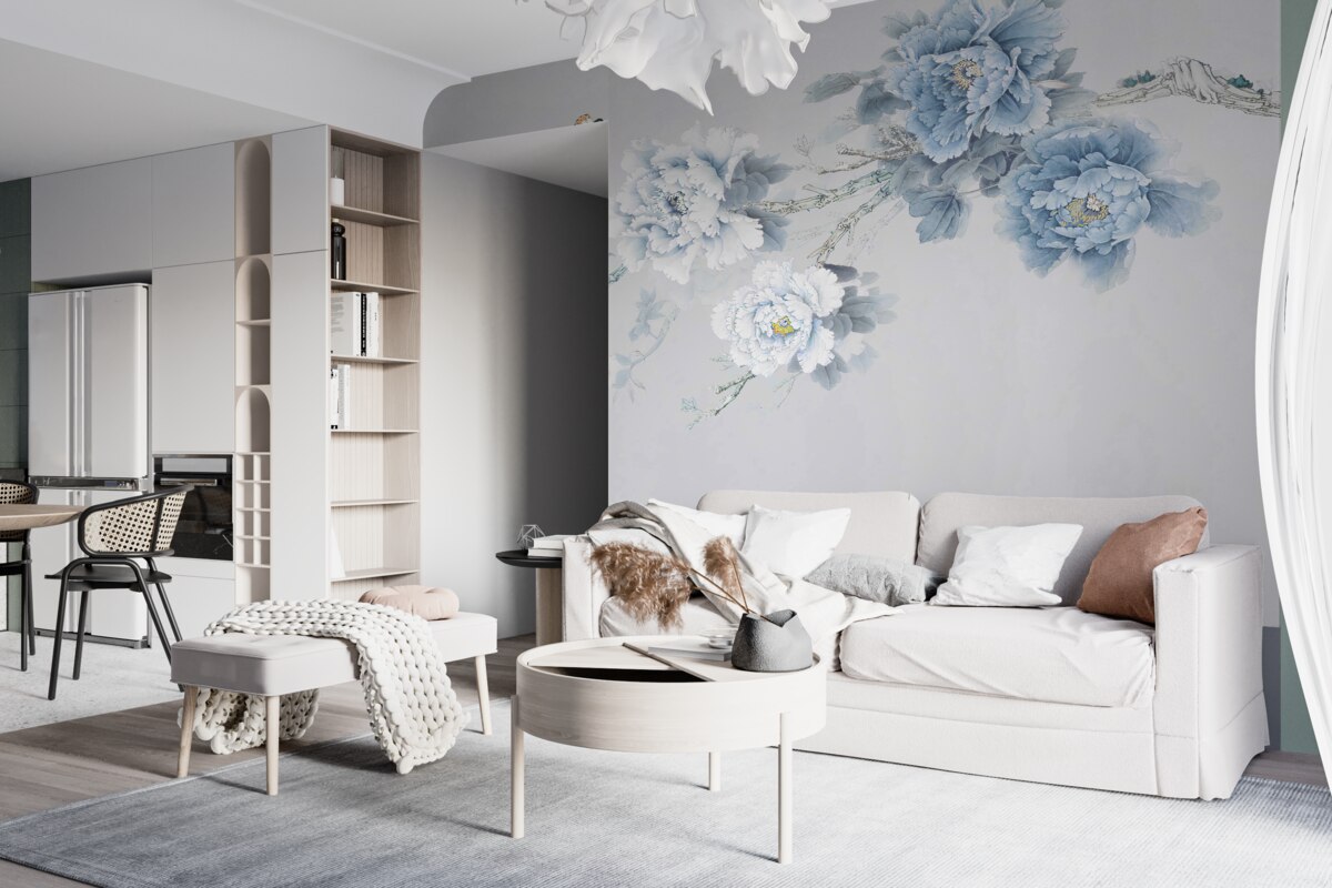 Tapeta Fototapeta białe i niebieskie pąki kwiatowe na szarym tle (artykuł a95560 ) z kategorii Fototapety Popularne