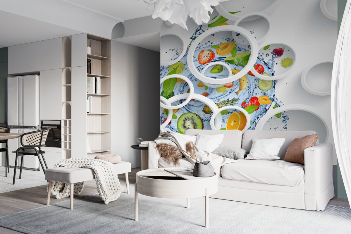 Tapeta Fototapeta białe kółka i owoce (artykuł a96394 ) z kategorii Fototapety Popularne