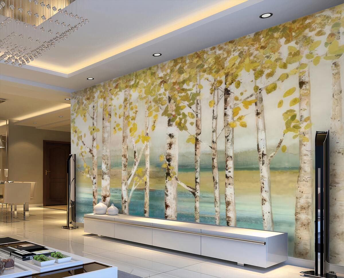 Tapeta Fototapeta brzozy z żółtymi liśćmi w pobliżu wody (artykuł a97013 ) z kategorii Fototapety Popularne