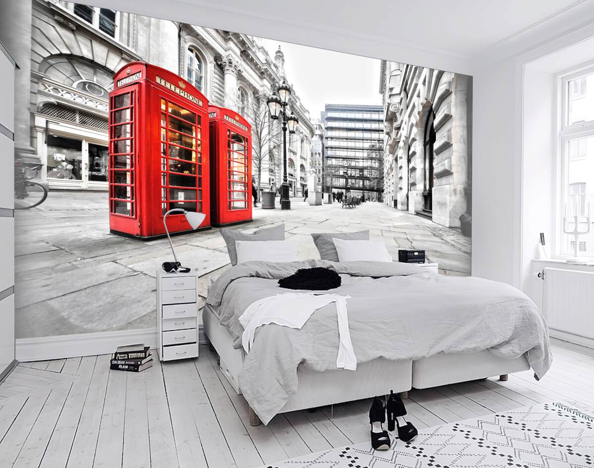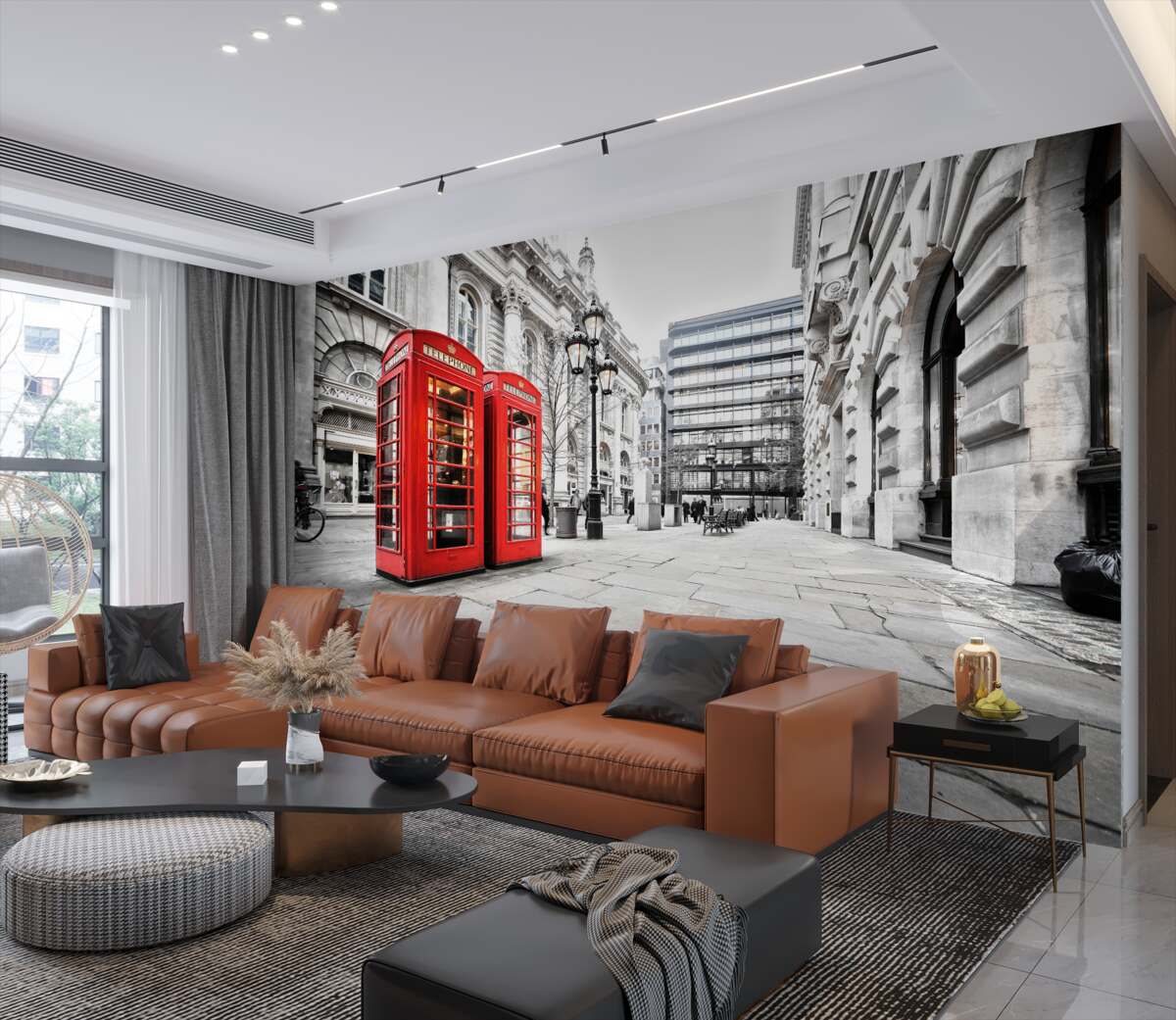 Tapeta Fototapeta czerwone budki telefoniczne w szarym mieście (artykuł a95852 ) z kategorii Fototapety Popularne