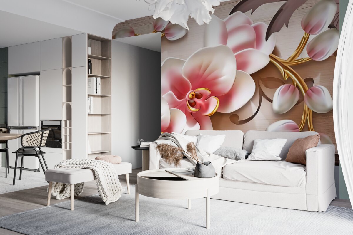 Tapeta Fototapeta delikatne różowe kwiaty z cienkimi złotymi gałązkami (artykuł a96281 ) z kategorii Fototapety Popularne