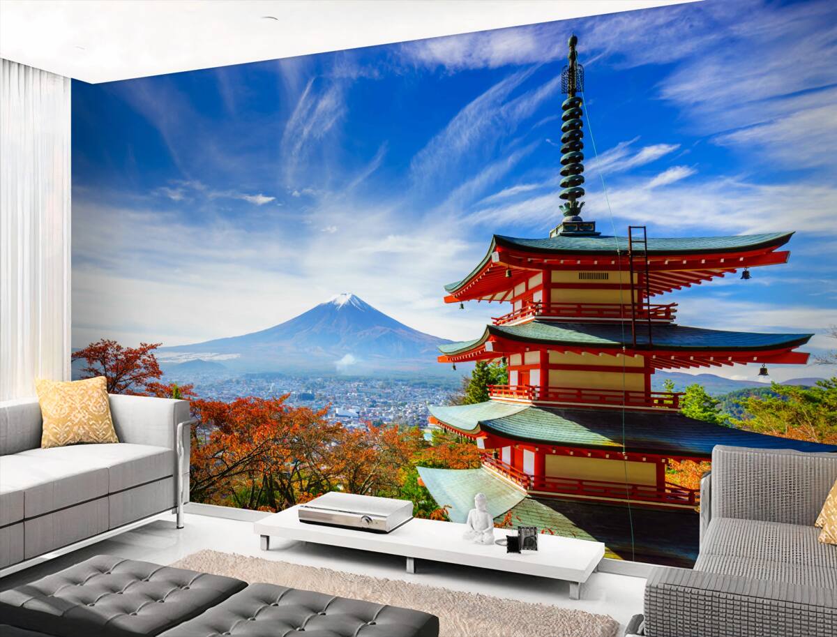 Tapeta Fototapeta dom w lesie z Fuji w tle (artykuł a95651 ) z kategorii Fototapety Popularne