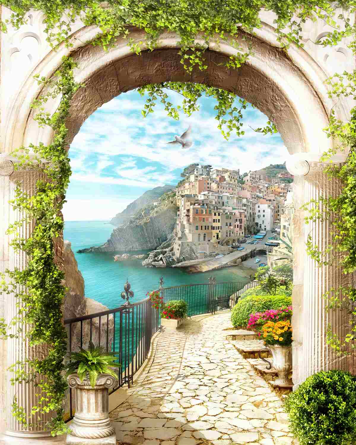 Tapeta Fototapeta domy na klifie nad wodą (artykuł a97078 ) z kategorii Fototapety Popularne