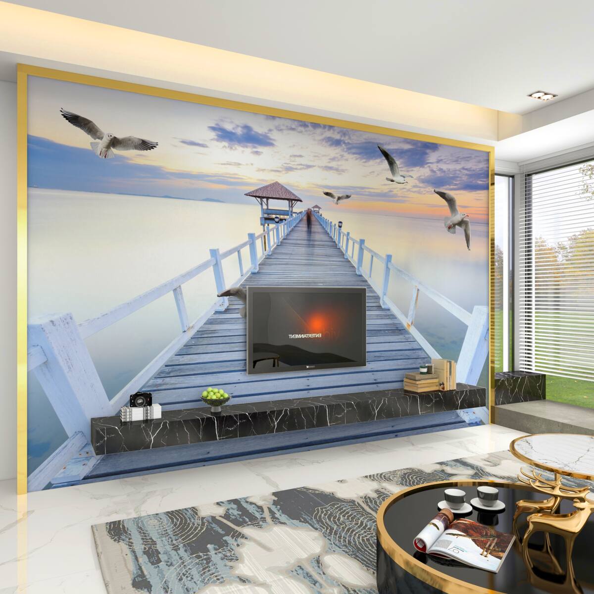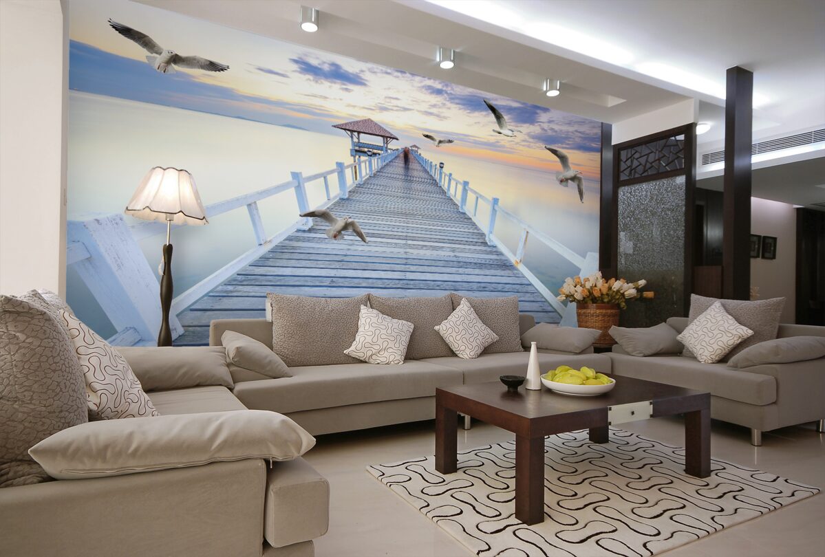 Tapeta Fototapeta drewniane molo i latające mewy (artykuł a95033 ) z kategorii Fototapety Popularne