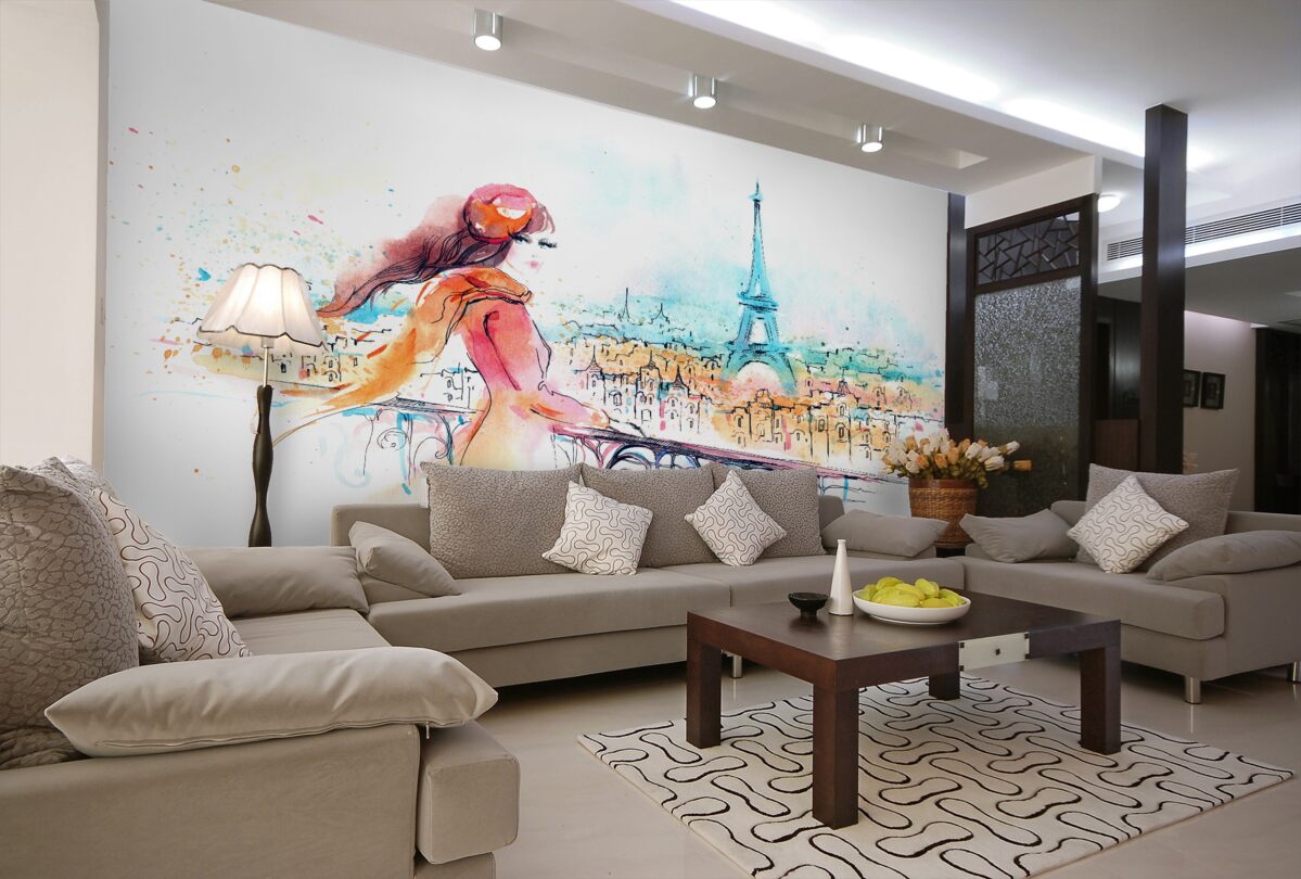 Tapeta Fototapeta dziewczyna spaceruje po akwarelowym Paryżu (artykuł a95434 ) z kategorii Fototapety Popularne