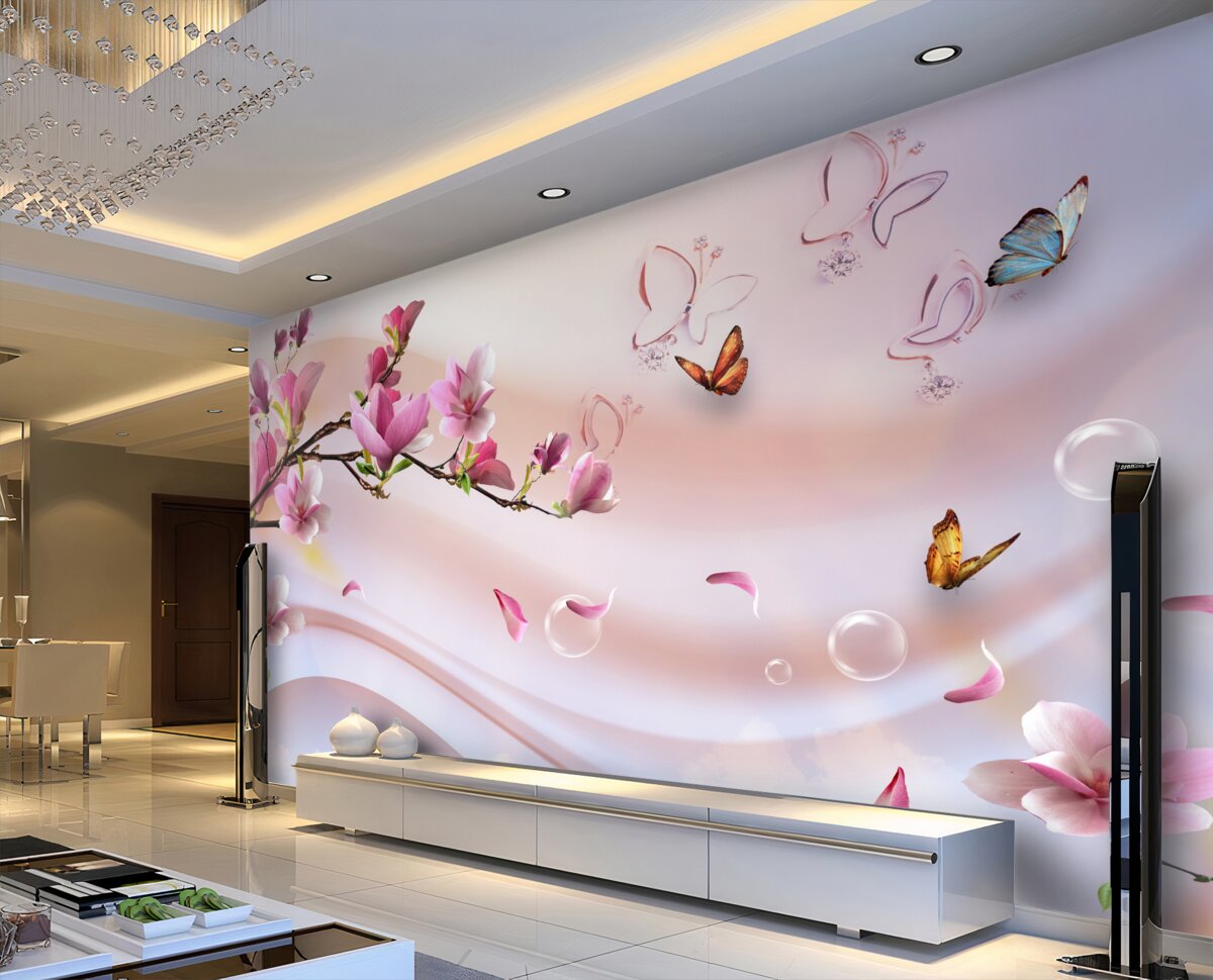 Tapeta Fototapeta gałązka z różowymi kwiatami i motylami (artykuł a96430 ) z kategorii Fototapety Popularne