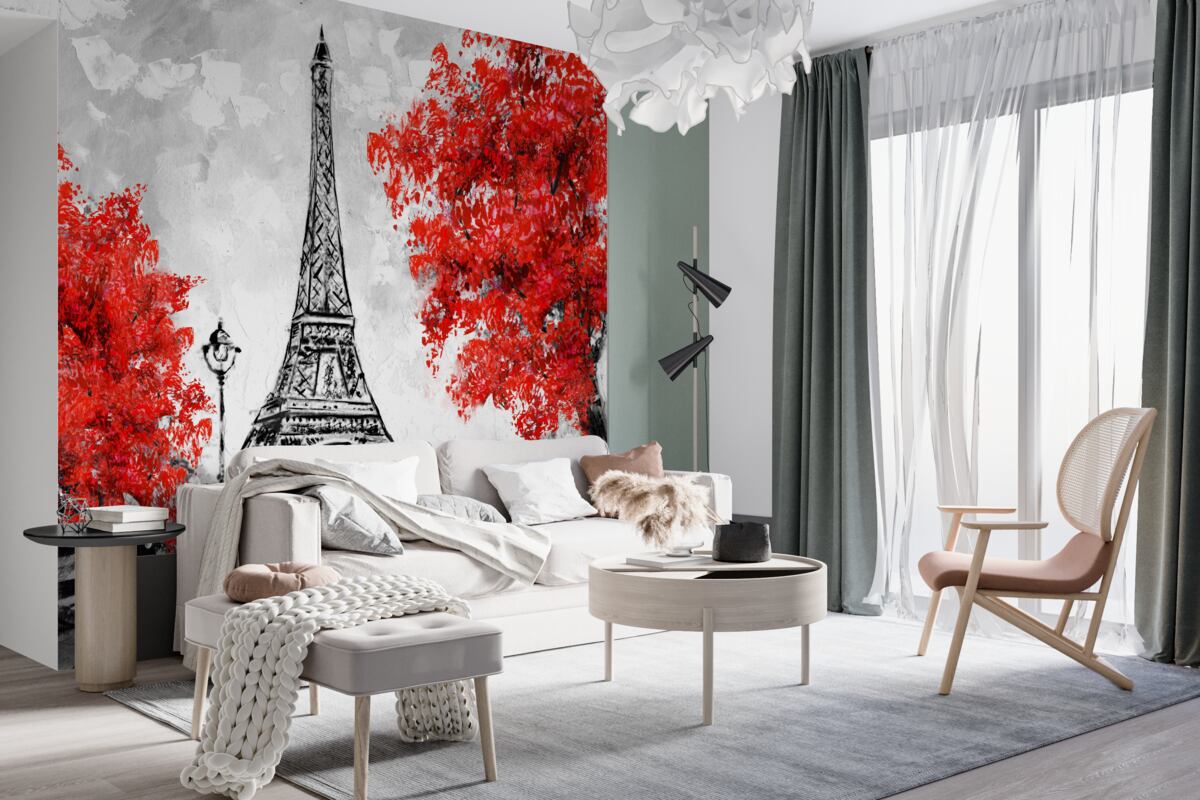 Tapeta Fototapeta gęste czerwone drzewa w pobliżu paryskiej wieży (artykuł a95893 ) z kategorii Fototapety Popularne