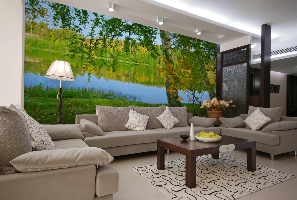 Tapeta Fototapeta gęsty letni las w odbiciu rzeki (artykuł a95202 ) z kategorii Fototapety Popularne