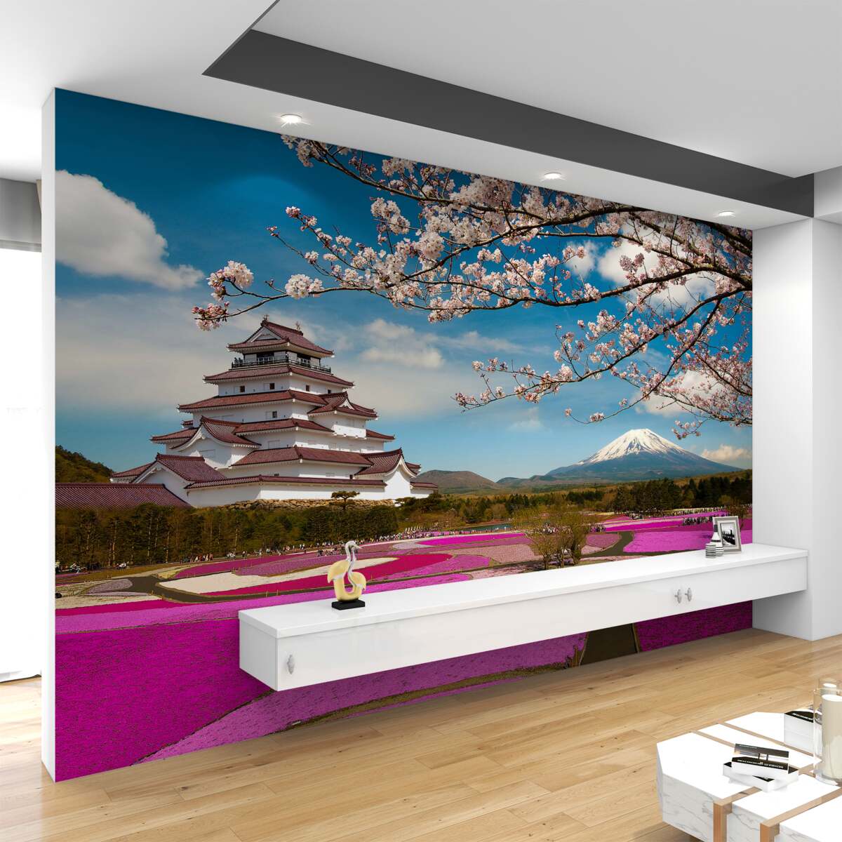 Tapeta Fototapeta jasne ogrody tulipanów w pobliżu japońskiego domu (artykuł a95715 ) z kategorii Fototapety Popularne