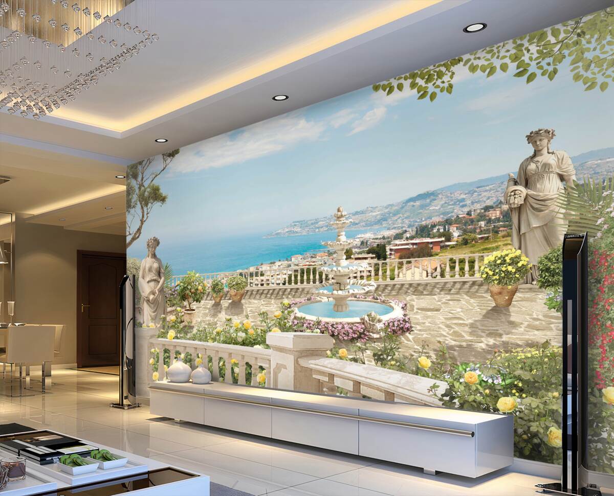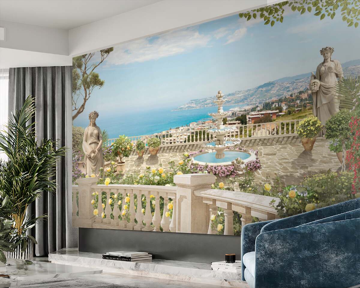 Tapeta Fototapeta kamienna altana z fontanną i widokiem na ocean (artykuł a95882 ) z kategorii Fototapety Popularne