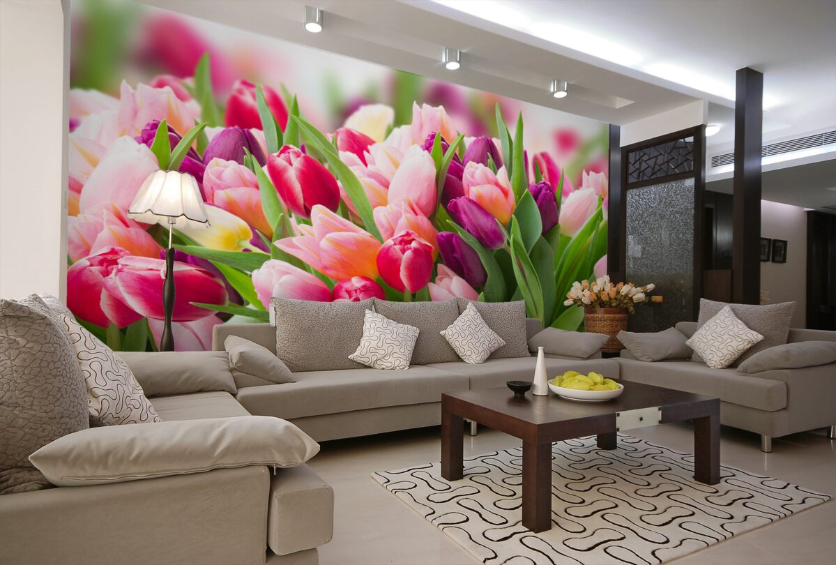 Tapeta Fototapeta kolorowe wiosenne tulipany z zielenią (artykuł a95768 ) z kategorii Fototapety Popularne