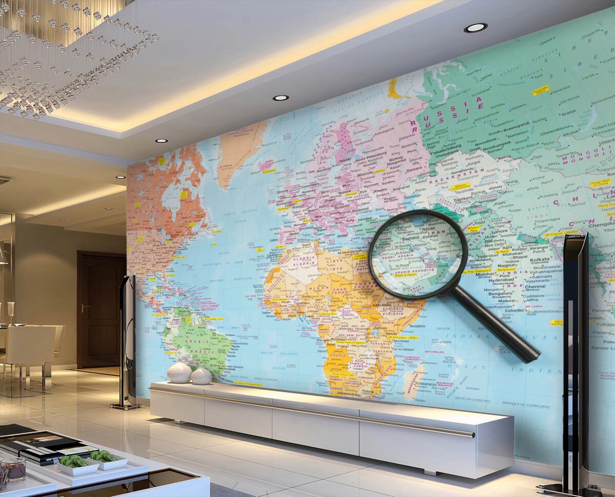 Tapeta Fototapeta mapa świata z kolorowym szkłem powiększającym (artykuł a95633 ) z kategorii Fototapety Popularne