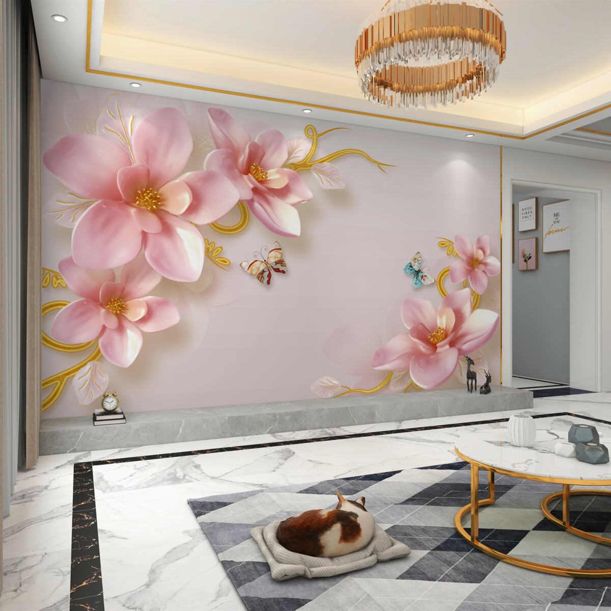 Tapeta Fototapeta motyle latają w pobliżu różowych kwiatów (artykuł a97308 ) z kategorii Fototapety Popularne