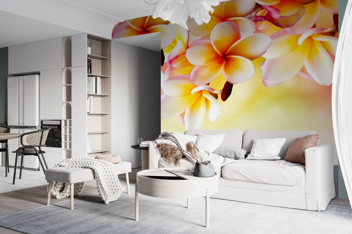 Tapeta Fototapeta nad wodą wiszą białe i pomarańczowe kwiaty (artykuł a96041 ) z kategorii Fototapety Popularne