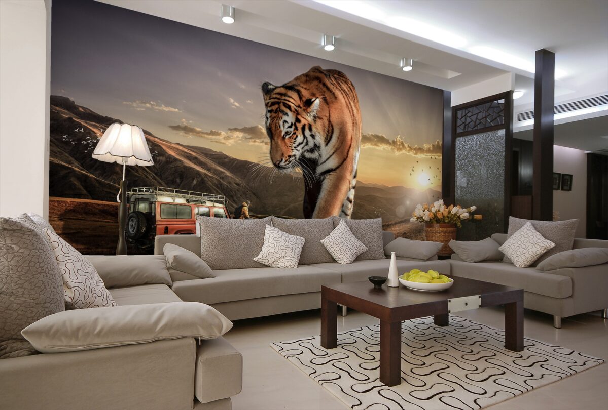 Tapeta Fototapeta ogromny tygrys patrzy na samochód (artykuł a97318 ) z kategorii Fototapety Popularne