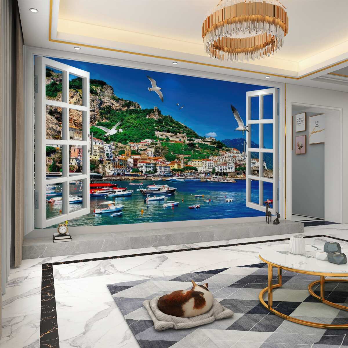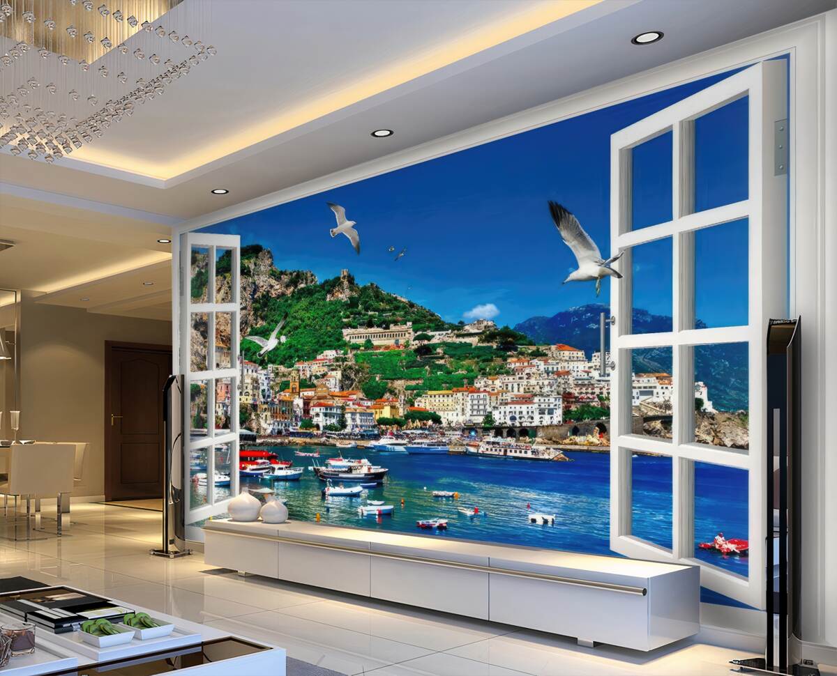 Tapeta Fototapeta okno z widokiem na morze i miasto (artykuł a97008 ) z kategorii Fototapety Popularne