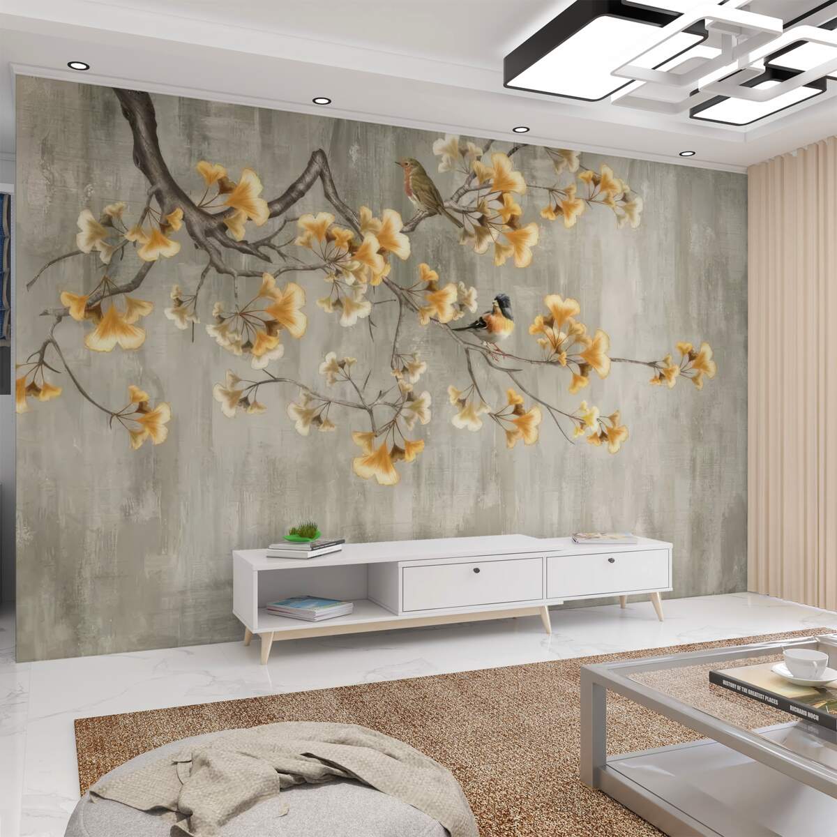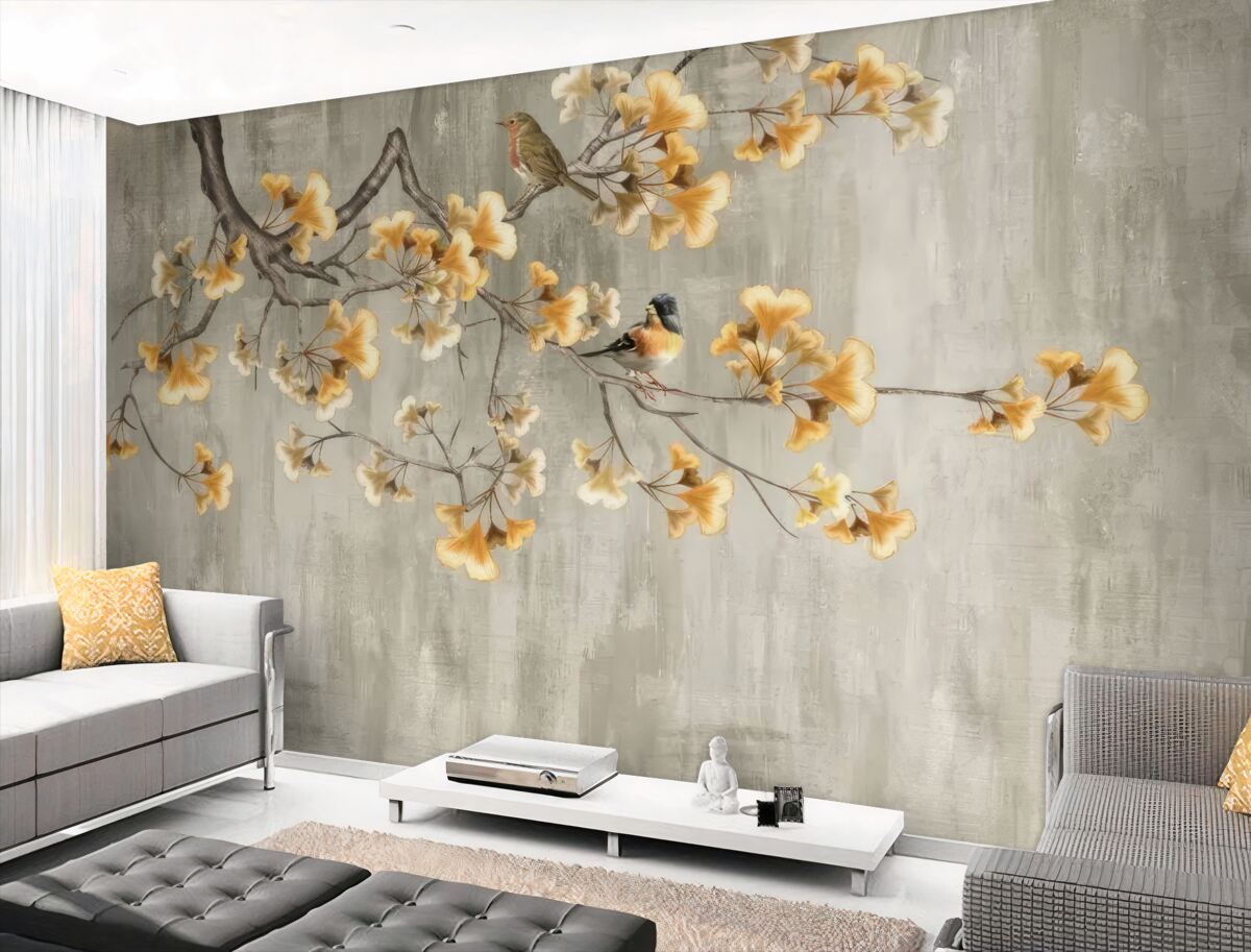 Tapeta Fototapeta ptaki siedzą na gałęzi z żółtymi kwiatami (artykuł a96990 ) z kategorii Fototapety Popularne
