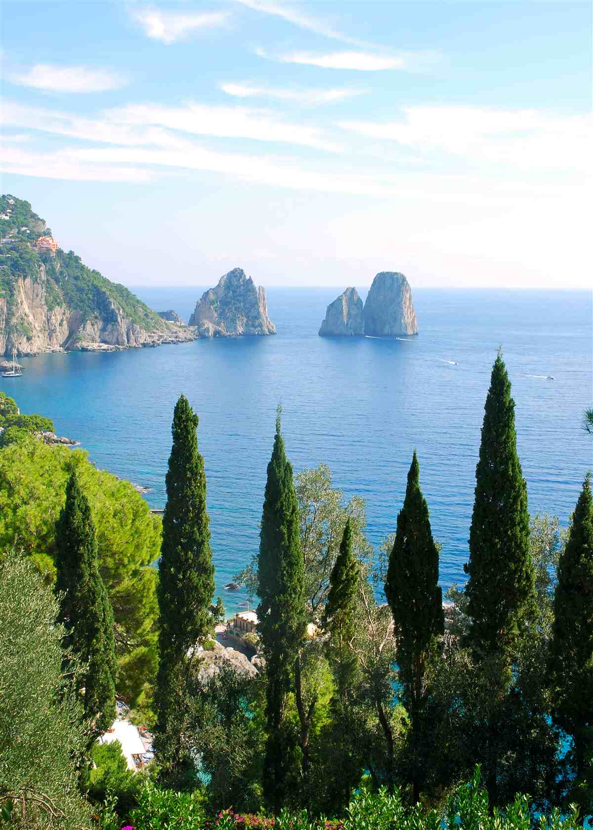 Fototapeta skaliste wybrzeże i smukłe cyprysy