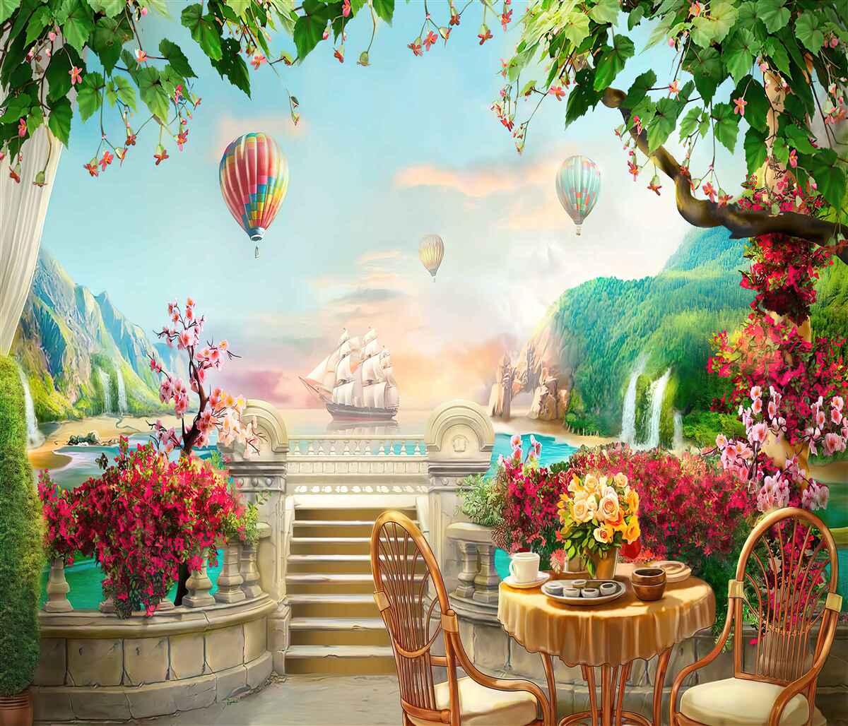 Tapeta Fototapeta śniadanie na zewnątrz z pięknym widokiem (artykuł a97057 ) z kategorii Fototapety Popularne