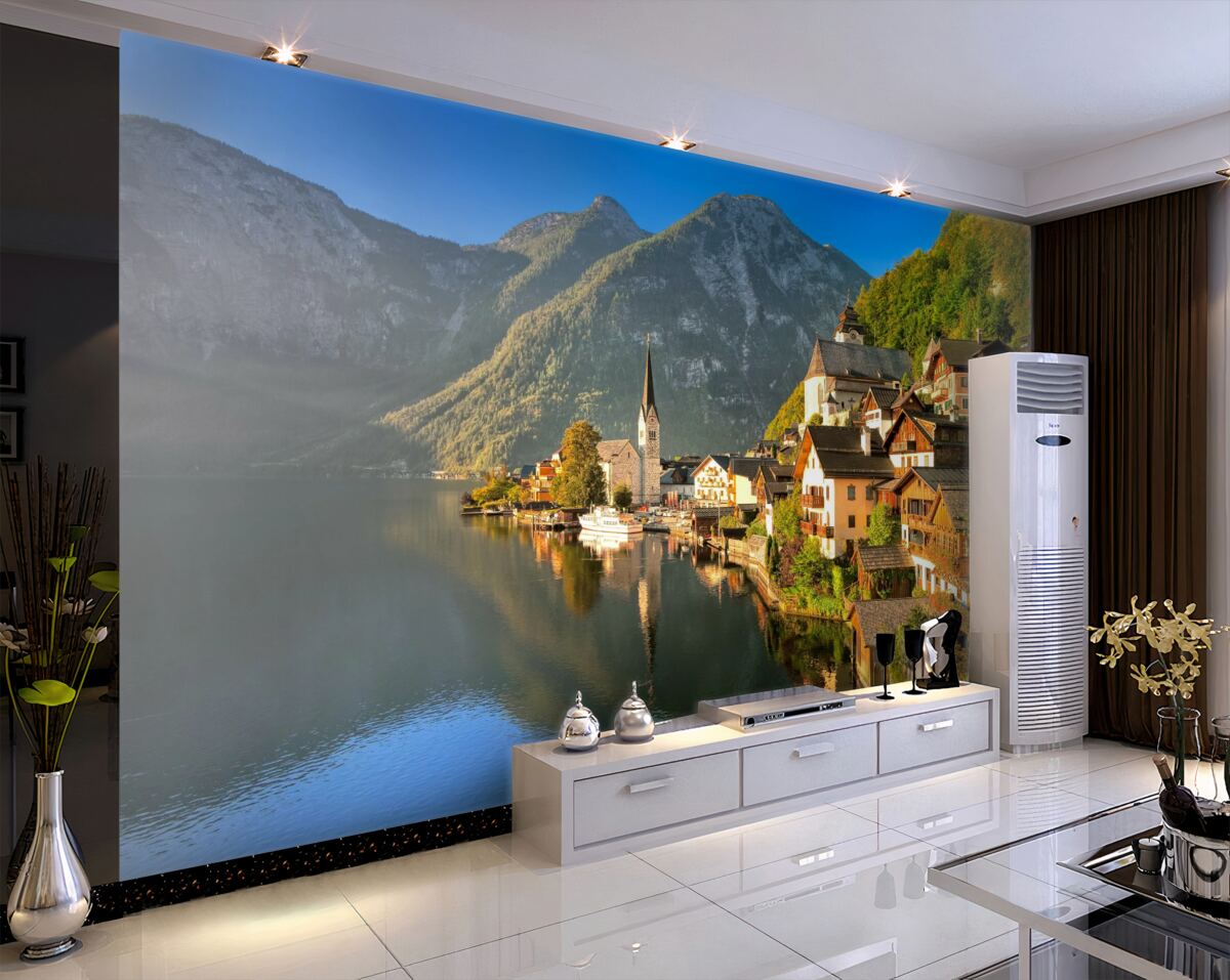 Tapeta Fototapeta Szwajcarska wioska blisko wody i gór (artykuł a95888 ) z kategorii Fototapety Popularne