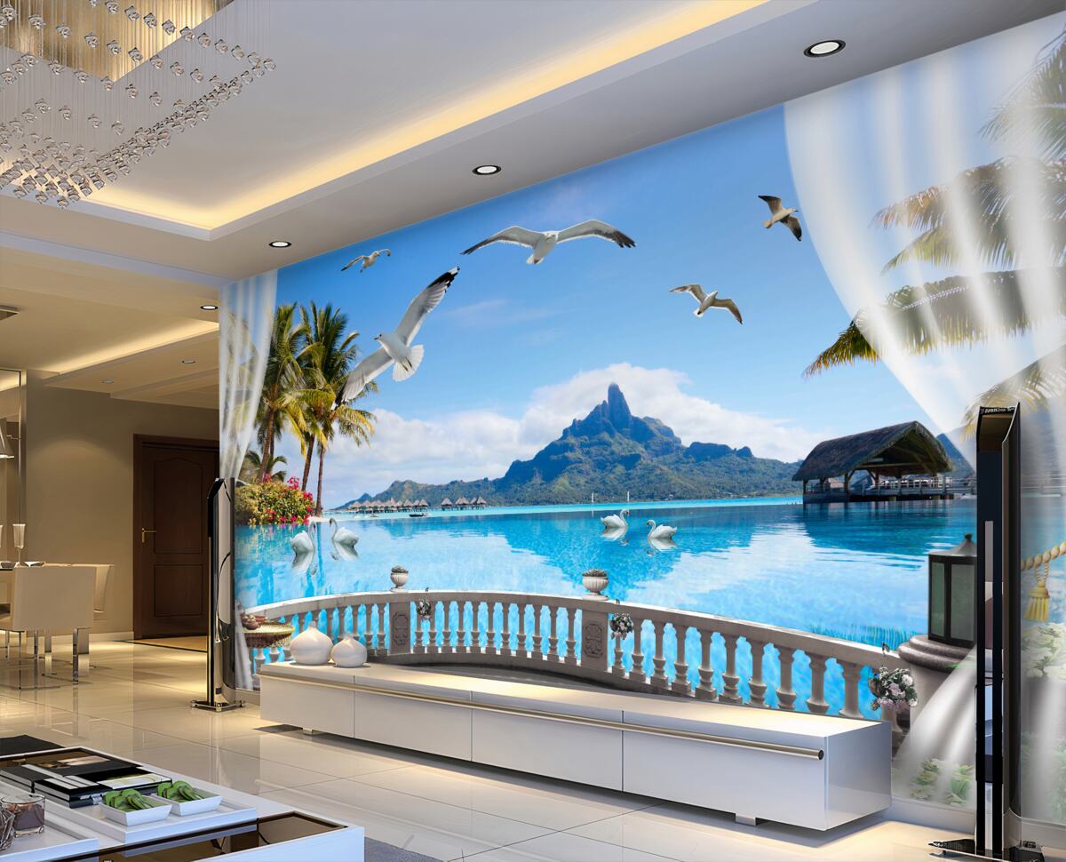 Tapeta Fototapeta taras z widokiem na wodę i góry (artykuł a96249 ) z kategorii Fototapety Popularne