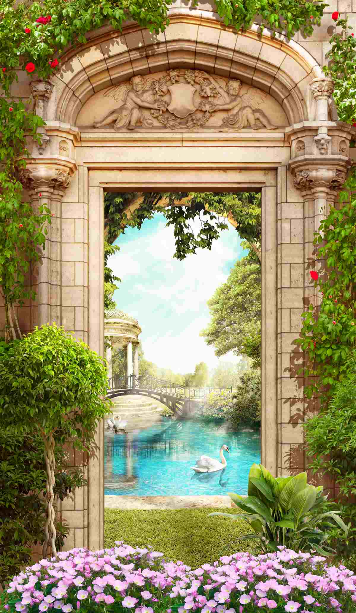 Tapeta Fototapeta widok z podcienia na altankę i jezioro łabędzie (artykuł a96745 ) z kategorii Fototapety Popularne
