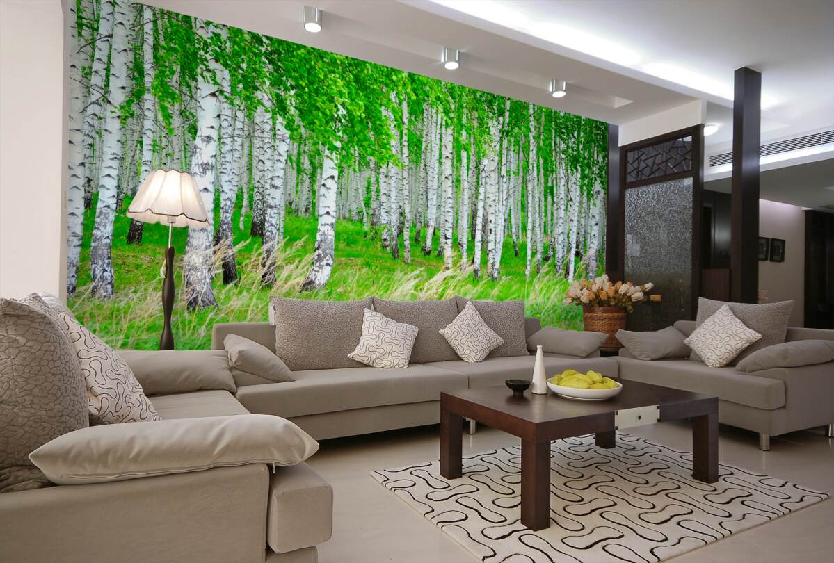 Tapeta Fototapeta zielona łąka przed brzozami (artykuł a97522 ) z kategorii Fototapety Popularne