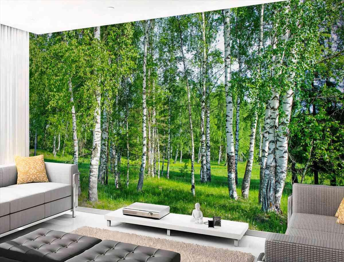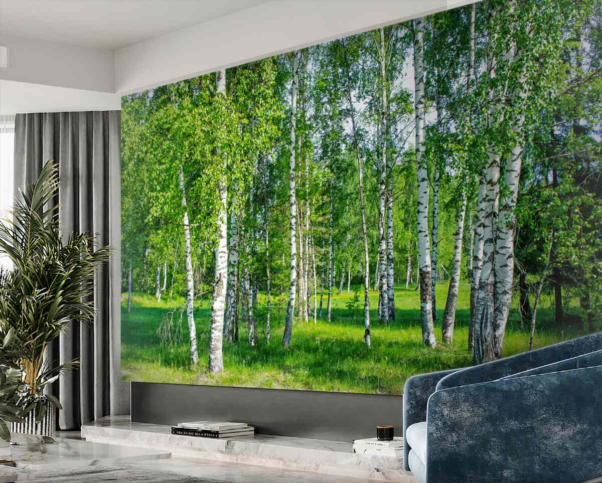 Tapeta Fototapeta zielone brzozy w letnim gaju (artykuł a95857 ) z kategorii Fototapety Popularne