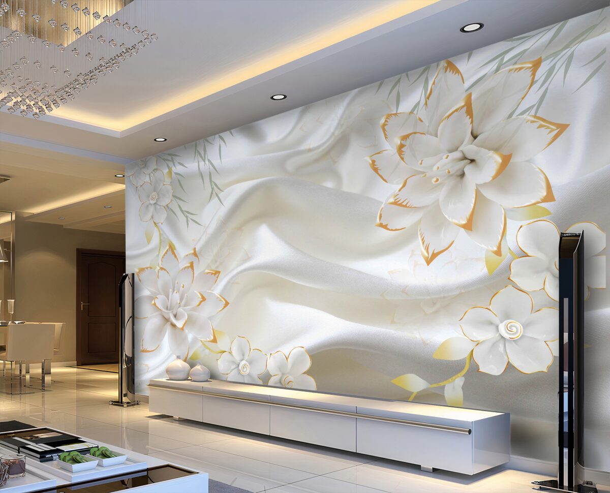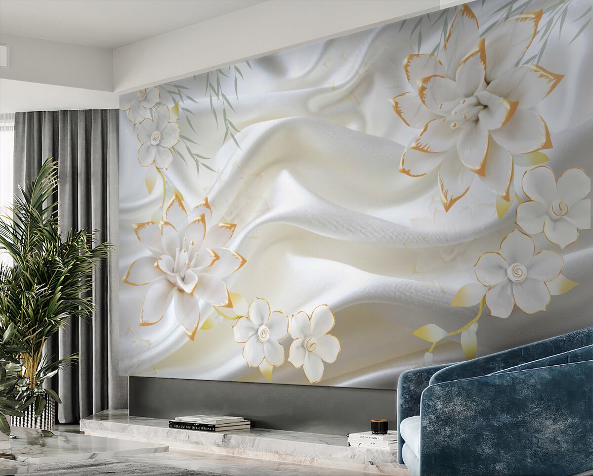 Tapeta Fototapeta złote kwiaty na śnieżnobiałym jedwabiu (artykuł a96175 ) z kategorii Fototapety Popularne