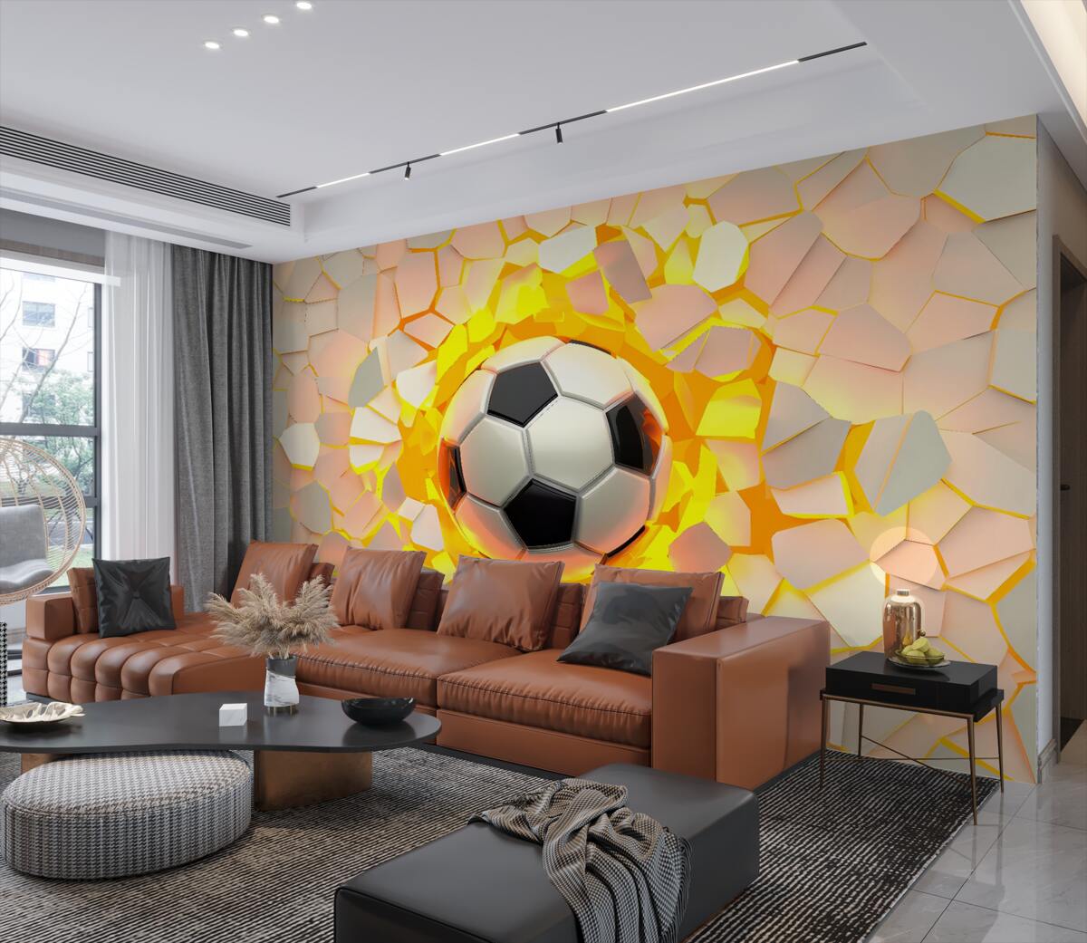 Tapeta Fototapeta Piłka nożna rozbija ścianę złotym blaskiem (artykuł a97821 ) z kategorii Fototapety Sport