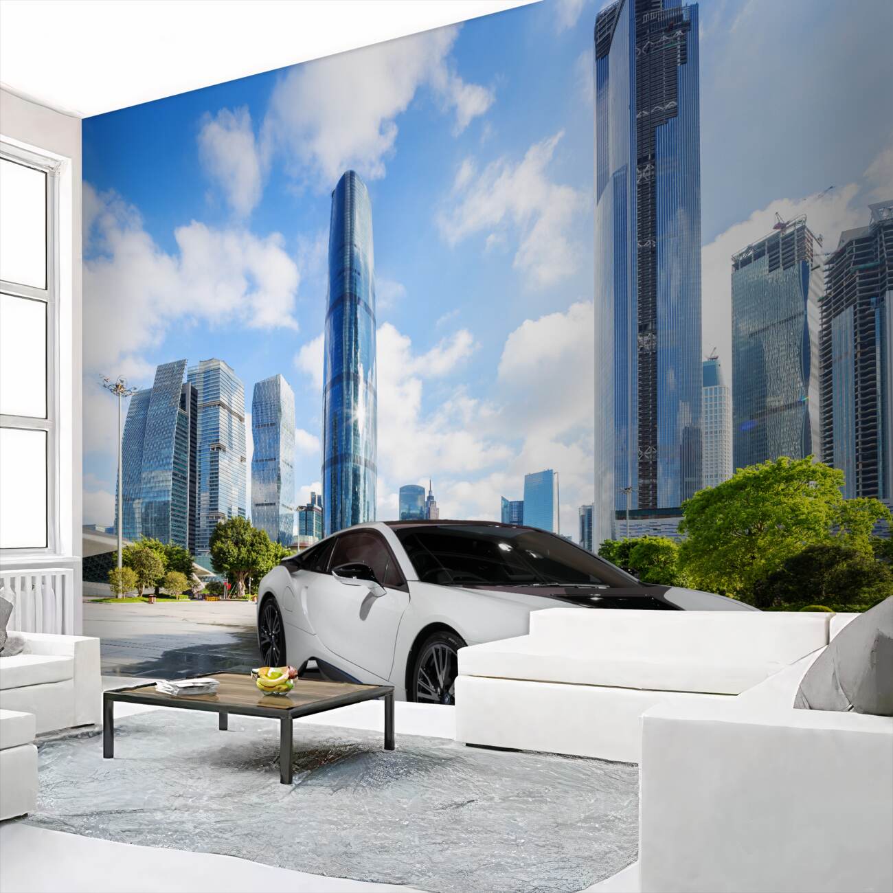 Tapeta Fototapeta Biały samochód w nowoczesnym mieście (artykuł a100185 ) z kategorii Fototapety Transport