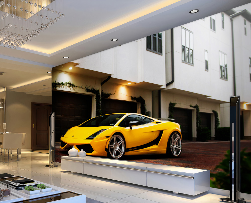Tapeta Fototapeta elegancki żółty samochód w pobliżu domu (artykuł a92790 ) z kategorii Fototapety Transport