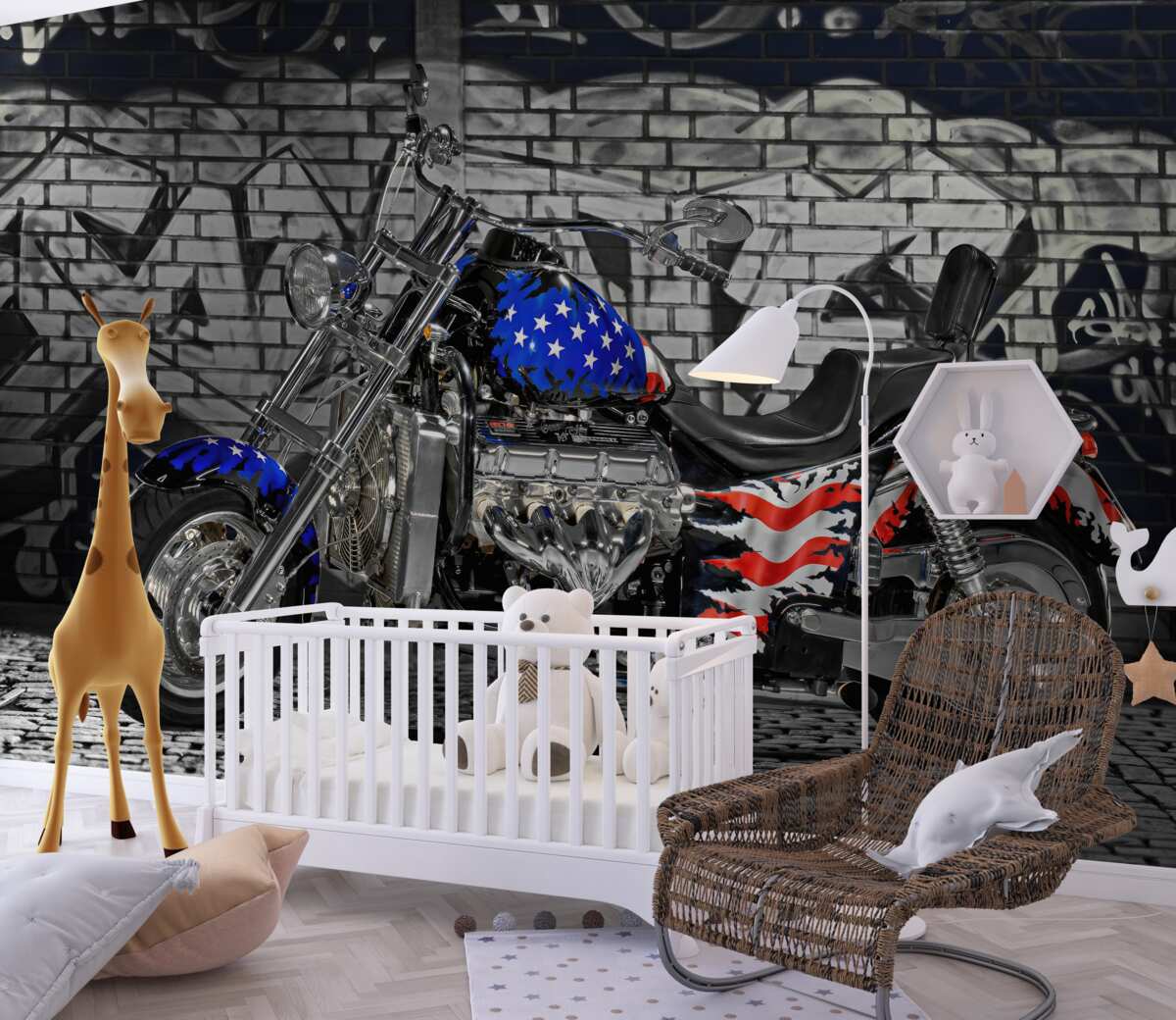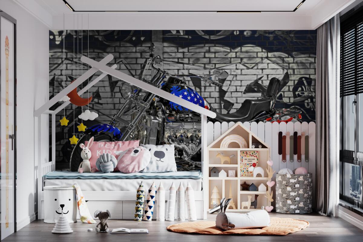 Tapeta Fototapeta Motocykl na ścianie z graffiti (artykuł a97247 ) z kategorii Fototapety Transport